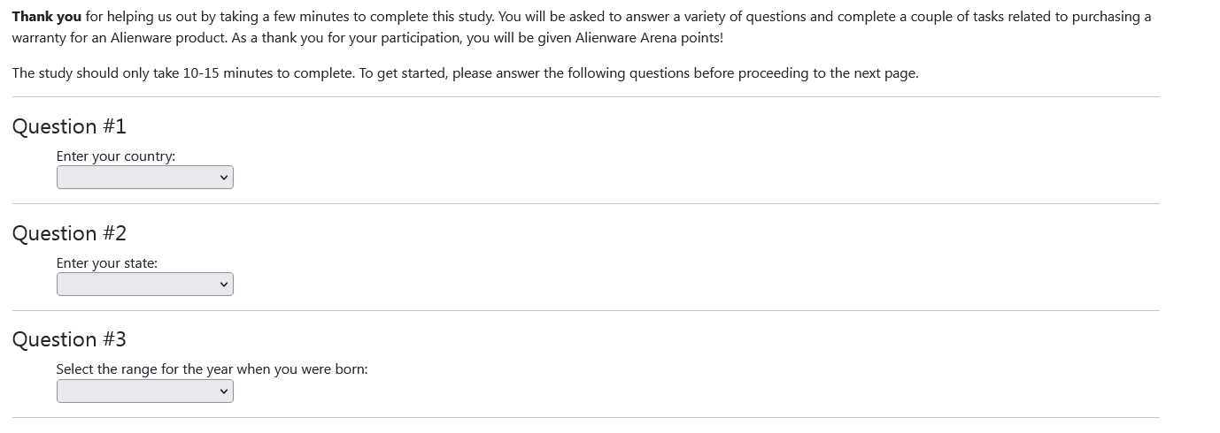 Questions 1-3 of the survey have blank options displayed, but the rest is totally usable. It's also a Tuesday. Odd day to start having a survey quest. It's also my birthday today, but nevermind that.