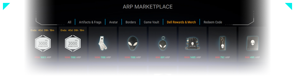 Users can spend their ARP on a variety of things in the Marketplace. There's new cosmetics for your avatar, physical Dell Merch and Dell rewards for eligible countries, artifacts you can equip to your avatar to earn ARP even faster, and Game Vault!
